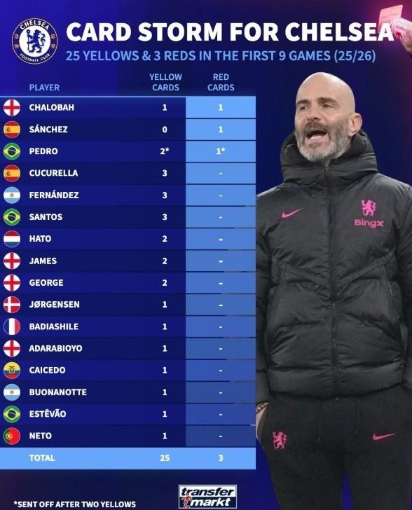 10月1日讯 德国转会商场统计,切尔西新赛季前9场比赛,领到25张黄牌和3张红牌。