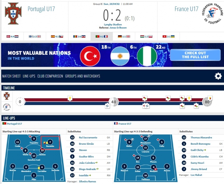 1、2002年,U17欧洲杯,葡萄牙U17 0-2 法国U17(2黄变1红)