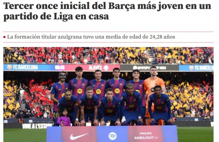 芳华风暴!世体:巴萨赢阿拉维斯的首发声势平均年级为24.28岁
