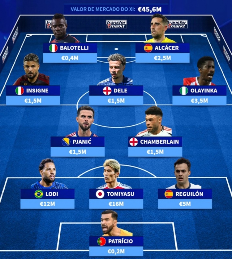 中场:皮亚尼奇(150万欧)、张伯伦(150万欧)、因西涅(150万欧)、阿里(150万欧)、奥拉因卡(350万欧)