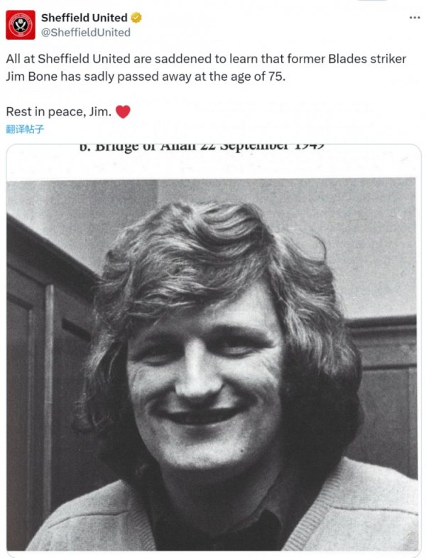 前谢菲联前卫吉姆-博恩去世&享年75岁,谢菲联社媒发文默哀