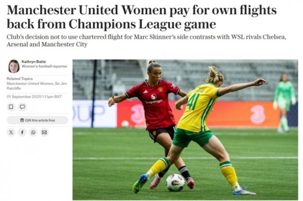 电讯报:曼联让女足私费购买欧冠客场返程机票,部分球员很大怒