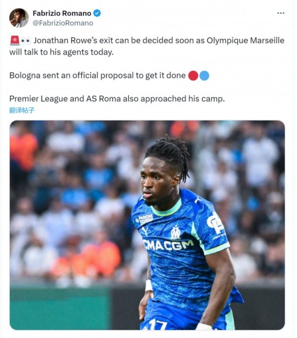 罗马诺:博洛尼亚报价马赛边锋洛维,罗马和英超球队也与球员征询