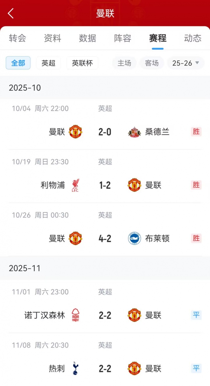 最近的五轮联赛中,曼联一度接连投诚桑德兰、利物浦、布莱顿,得回三连胜;上轮联赛2-2战平丛林。本轮对阵热刺的比赛,曼联在全场补时阶段被反超的情况下,由德里赫特打进了绝平的进球,从客场带走一分。