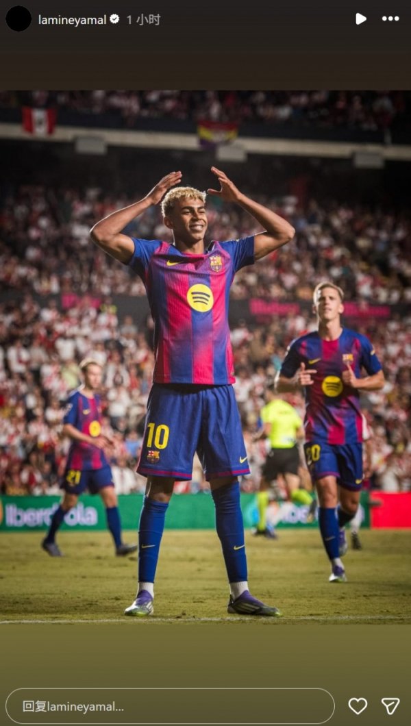 新王加冕,亚马尔社媒晒本轮“戴皇冠”庆祝进球看成相片