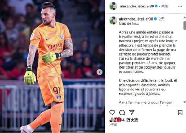 纪律15年做事生活!官方:34岁前巴黎圣日耳曼门将莱特利尔退役