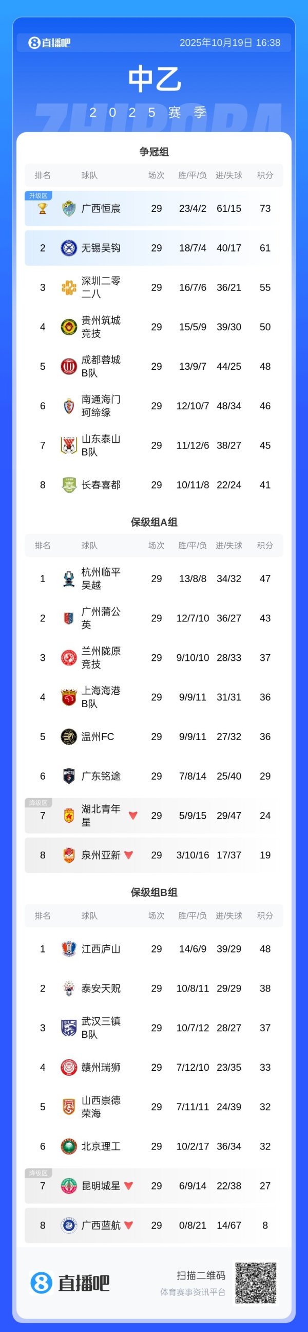 10月19日讯 中乙冲甲组第29轮,无锡吴钩2-1慑服成王人蓉城B队,奏效冲入下赛季中甲联赛。 当今,无锡吴钩18胜7平4负积61分,跨越第三名深圳二零二八6分,提前一轮锁定中乙冲甲组第二。......查看更多