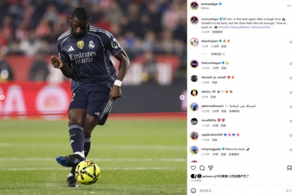 伤愈复出,吕迪格社媒晒照:感恩简略重返赛场,但平局难言惬意