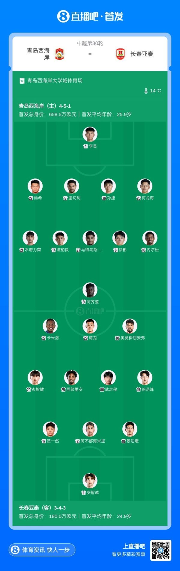 中超收官|西海岸vs亚泰首发:谭龙先发 赛后将举行邵佳一告别庆典