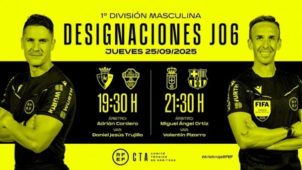 9月24日讯 北京时辰9月26日,2025-26赛季西甲联赛第6轮将进行两场比赛的较量,西班牙足协官方本日公布了两场比赛的裁判安排,奥蒂兹法律讲明巴萨客战皇家奥维耶多。 西甲第6轮两场比赛裁判安排: 奥萨苏纳VS埃尔切 主裁判:阿德里安-科尔德罗,VAR裁判:丹尼尔-赫苏斯-特鲁伊略; 皇家奥维耶多VS巴塞罗那 主裁判:米格尔-安赫尔-奥蒂兹,VAR裁判:瓦伦丁-皮萨罗。......查看更多