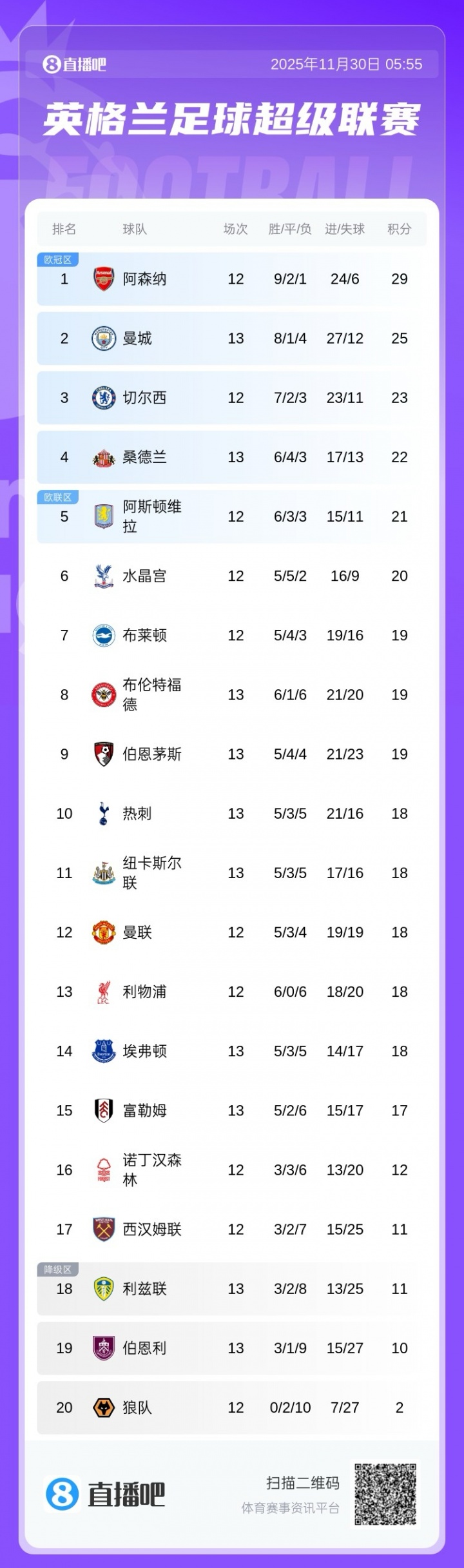 11月30日讯 英超第13轮,热刺1-2不敌富勒姆,曼城3-2绝杀利兹联,桑德兰3-2逆转伯恩茅斯,纽卡4-1埃弗顿。