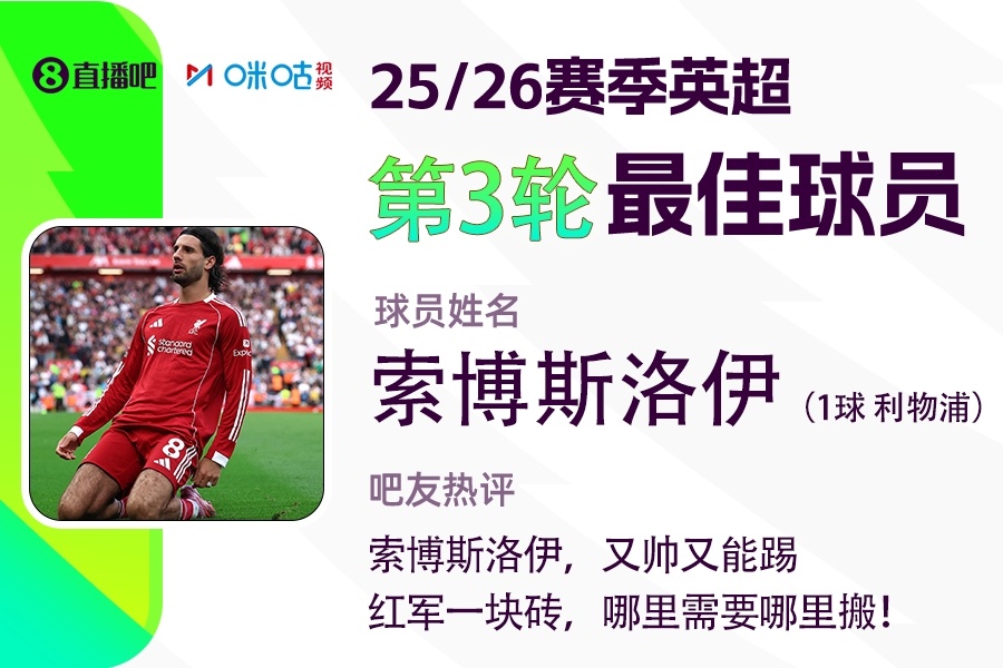 25-2026赛季英超火热进行中,和咪咕体育聚拢发起每轮英超最好球员评比行径!第三轮评比效果结出炉,利物浦中场索博斯洛伊攻入一粒超极狂放球天下波,匡助利物浦三连胜登顶!他获取吧友十几万吧友的投票撑抓,以较大上风当选 【X咪咕体育英超第3轮最好球员】!