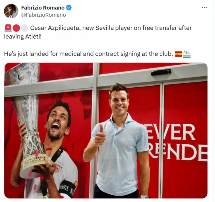 阿斯皮利奎塔今夏离开马竞,成为解放球员,罗马诺透露,这位36岁的西班牙后卫将免签加盟塞维利亚。