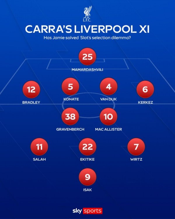 卡拉格排利物浦当今最相宜首发:4-2-3-1阵型,伊萨克单中锋
