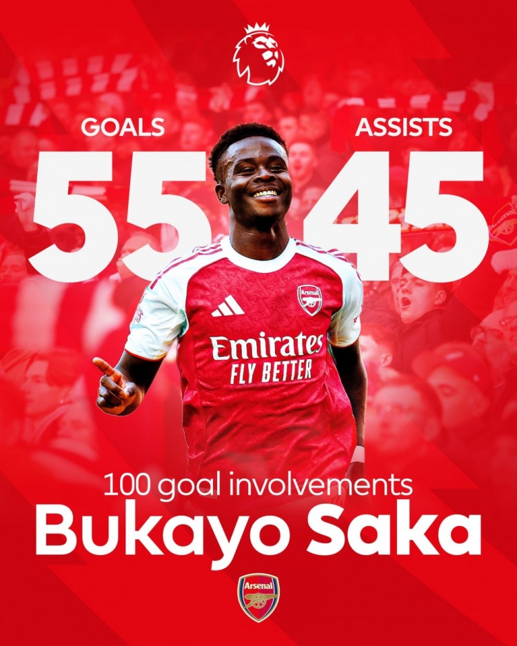 这是萨卡英超第200场里程碑之战,同期亦然萨卡英超参与进球数第100个。