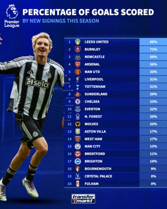 英超各队新援进球占球队总进球比例:利兹联86%最高,阿森纳第4