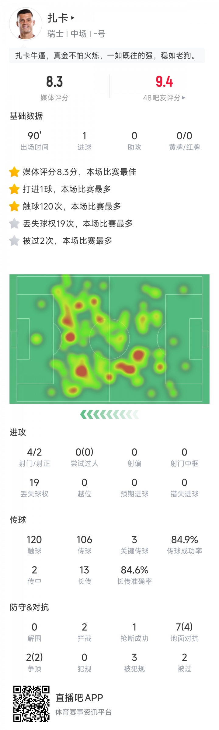 扎卡是瑞士世初赛全胜的中枢东说念主员之一,这位桑德兰后腰镇守中场,牢不行破。3场世初赛他一起原发打满,瑞士3战全胜进9球0失球。本场比赛对阵领有2亿锋线双东说念主组的瑞典,扎卡触球120次出野心策,他孝顺了3次枢纽传球,9反抗6收效等可以的数据。