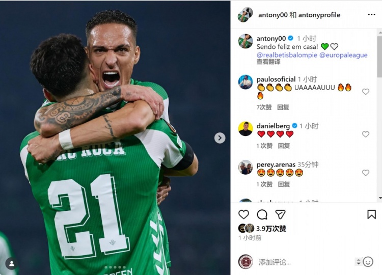 安东尼赛后在外交媒体上晒出庆祝进球的像片,配文:“在主场取胜太抖擞了!”