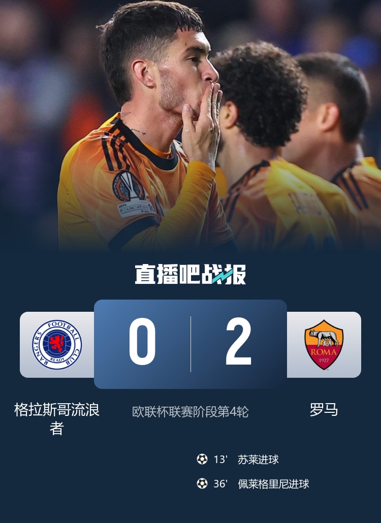 苏莱、佩莱格里尼破门,切利克中框失佛门。罗马断绝欧战两连败4轮6分,流浪者0分垫底。