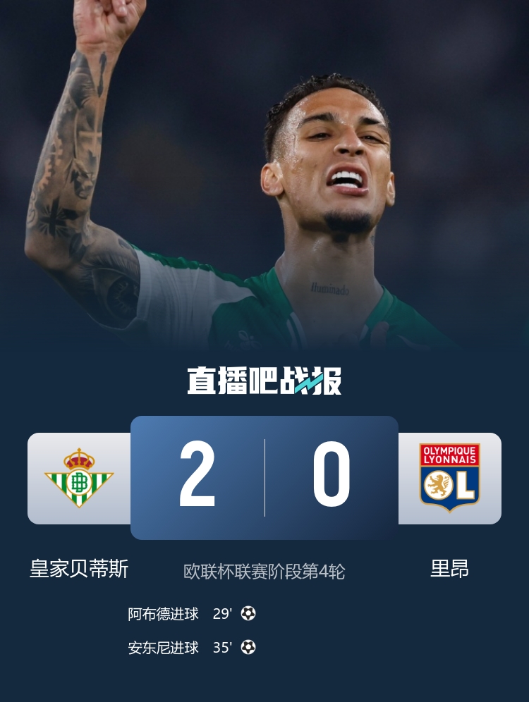 欧联杯联赛阶段第4轮比赛,皇家贝蒂斯主场迎战里昂,上半场比赛第35分钟,安东尼挑射破门,贝蒂斯2-0特殊。
