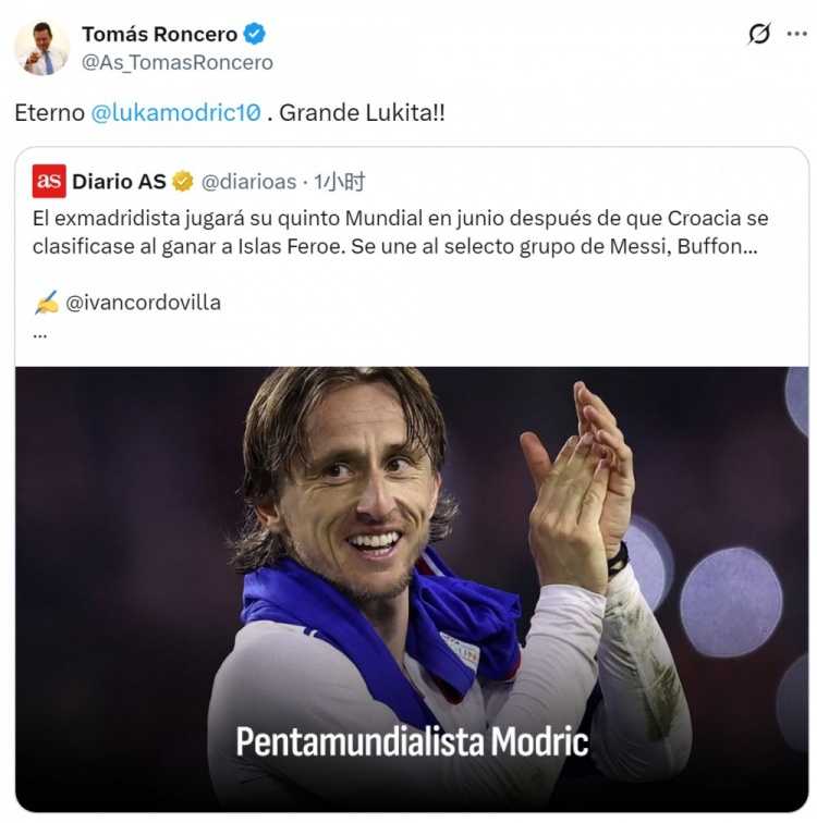 40岁克罗地亚中场莫德里奇将迎来我方的第5届寰球杯,西班牙媒体《阿斯报》主编、皇马球迷龙赛罗转发关系新闻,配文:“不灭的莫德里奇,伟大的卢卡(莫德里奇)!”