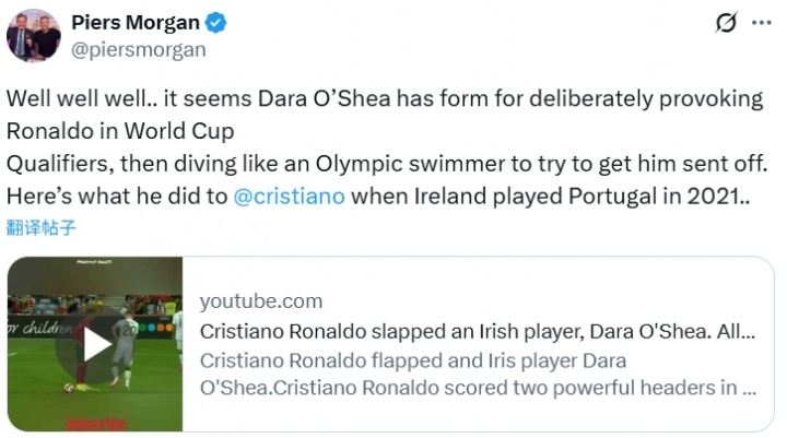 此外,摩根还曾暗意C罗比赛中肘击的爱尔兰队后卫奥谢早有前科,他曾谢世初赛专诚寻衅C罗而被后者击打手臂。