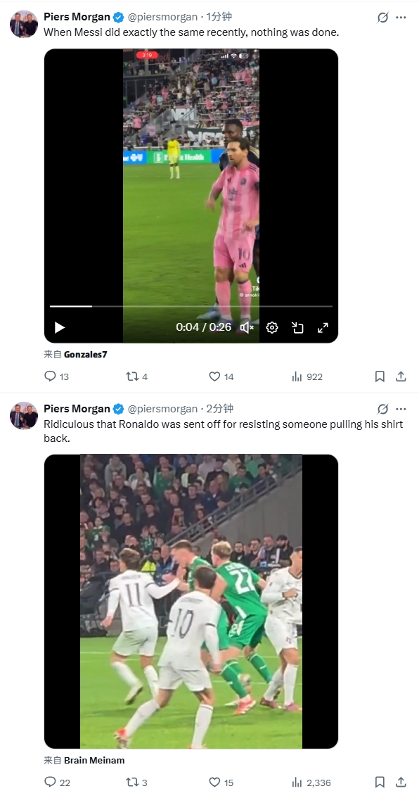 此前,摩根曾在社媒屡次声援染红的C罗,折柳晒出C罗与梅西的视频,并暗意C罗因为抵御他东谈主拉扯球衣而被红牌罚下荒谬失实,此外梅西最近相同的作为却莫得遭到刑事牵累。