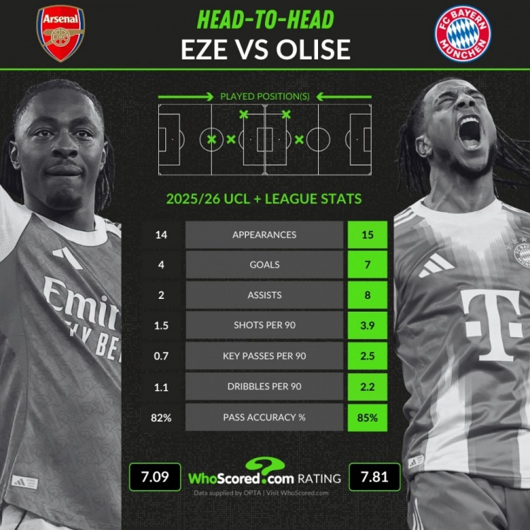 11月26日讯 拜虚心阿森纳行将迎来欧冠榜首之争,两位前水晶宫球员奥利塞和埃泽面前现象火热。whoscored也对比了两东谈主本赛季联赛+欧冠的场均重要数据,后者全面占优。
