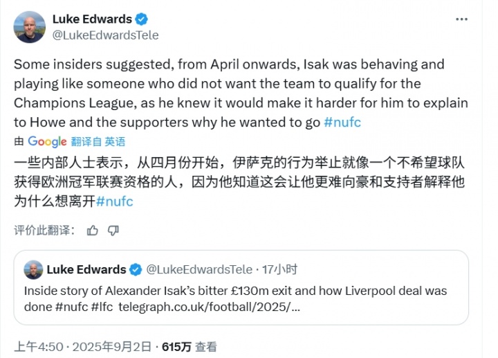 Luke Edwards:有里面东谈主士暗意,从四月起,伊萨克的弘扬和当作就像一个不但愿纽卡获取欧冠资历的东谈主,因为他知谈这会让他更难向主解说豪以及球迷解释他思离开的根由。
