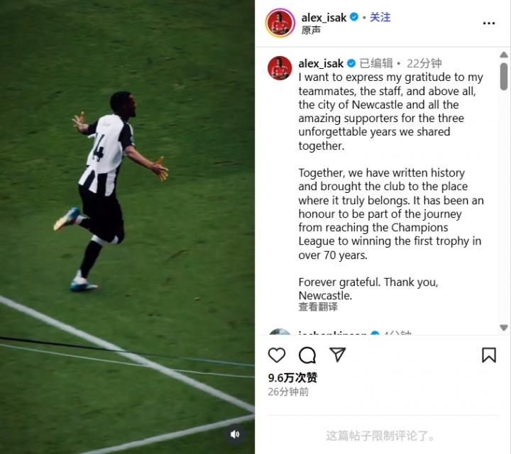 伊萨克写谈:“我要向我的队友们、责任主谈主员们,向宇宙,尤其是纽卡斯尔这座城市以及总共出色的球迷们,抒发我的谢意之情,感谢咱们总共渡过的这难以忘怀的三年。