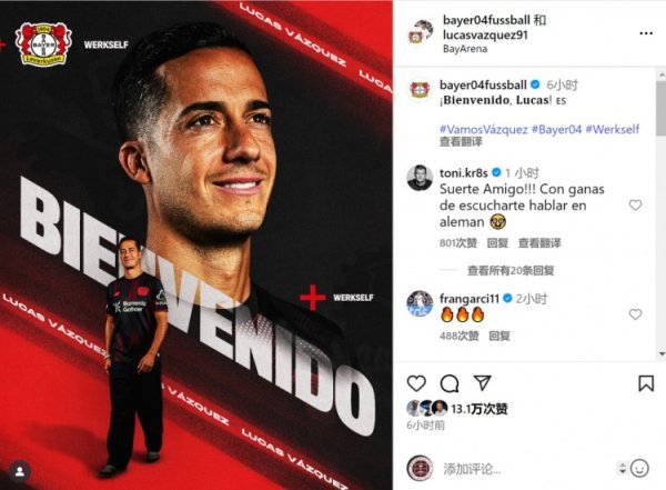 8月27日讯 巴斯克斯解放身加盟勒沃库森,前皇骑兵友克罗斯在官宣社媒后头留言。 勒沃库森官方社媒晓示免签巴斯克斯,他的皇马老队友克罗斯留言说念:“祝你好运,一又友,很期待听到你说德语!”......查看更多