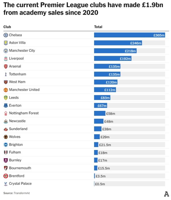 英超近5年出售青训收入:切尔西3.65亿第一 维拉2.46亿曼城2.18亿