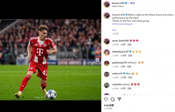 10月24日讯 拜仁在本轮欧冠4-0完胜布鲁日,小将伦纳特-卡尔开场天下波立功。 值得一提的是,这是他活命初度在欧冠首发,打进了欧冠处子球、成为拜仁队史最年青欧冠进球者,也在初度在赛后被欧冠官方评为全场最好球员。 他也在赛后通过社媒晒出我方的比赛照并配文:“在安联球场的精彩今夜,球队的涌现也太出色了!感谢球迷们,咱们会不绝前进。”......查看更多