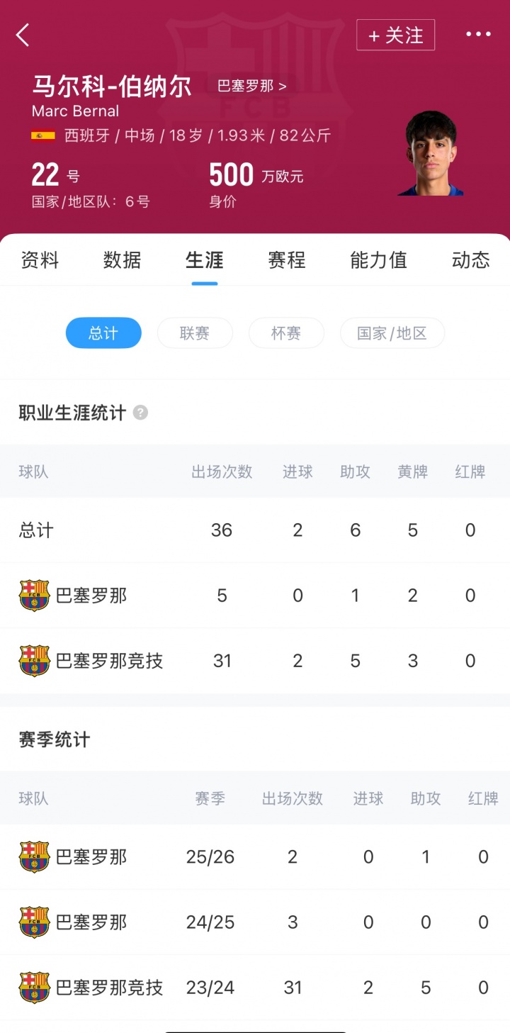 18岁的西班牙中场伯纳尔,出自巴萨拉玛西亚青训,上赛季伯纳尔碰到十字韧带扯破,伤缺卓著1年技能。本赛季伤愈复出后,伯纳尔仍是巴萨出战2场比赛,孝顺1次助攻,当今伯纳尔的德回身价为500万欧元。