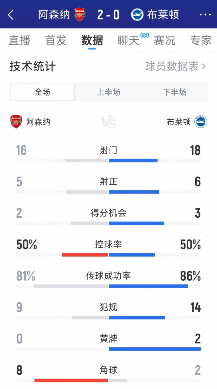 阿森纳2-0布莱顿全场数据:射门16-18,射正5-6,得分契机2-3
