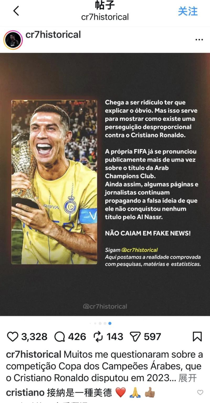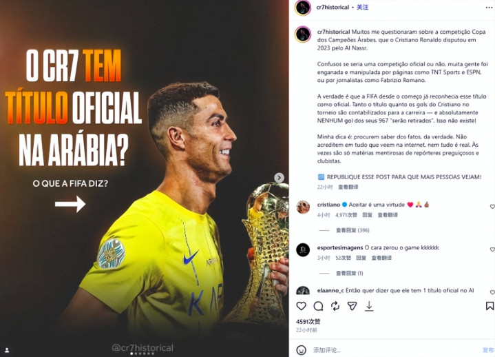 而针对阿拉冠究竟是不是国际足联承认的正式赛事,球迷们在网络上也是吵翻了天。其中,C罗的球迷号@cr7historical在近日发文,力挺C罗打进967球,并坚称ESPN、罗马诺等媒体在瞎说,称C罗在阿拉冠打进的6个球不应被扣掉。