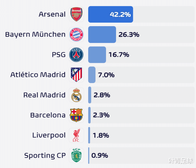 本赛季欧冠,8支球队的夺魁 概率如何?OPTA经过大数据模拟推演,给出预测: