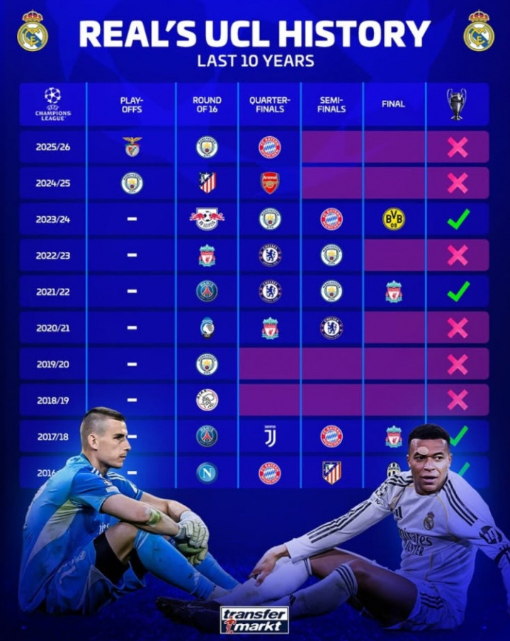 直播吧4月17日讯本轮欧冠八强战,皇马主场作战 1-2、客场应战 3-4被拜仁双杀出回合出局,《转会市场》也列出了皇马近10年的欧冠战绩及被出回合出局时的对手: