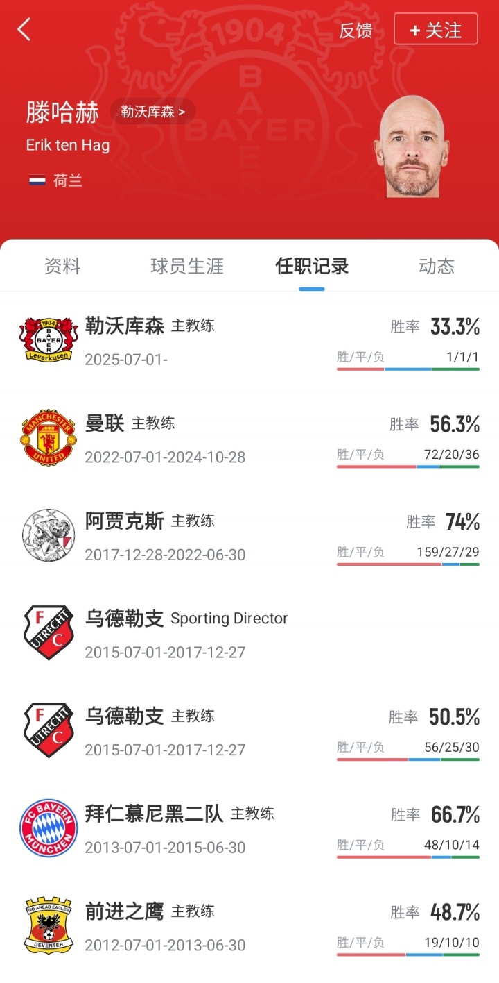 滕哈赫现年55岁,荷兰籍教养。曾先后抓教前进之鹰、拜仁二队、乌得勒支、阿贾克斯、曼联以及勒沃库森。