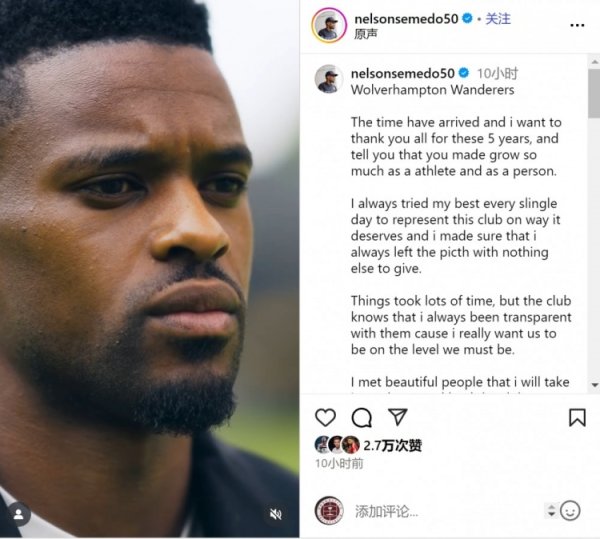 投靠穆帅!塞梅多告别狼队:感谢公共的援手,在这里我成长了好多