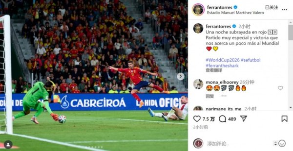 费兰社媒:为西班牙队出战50场,奏凯让咱们离天下杯更近一步